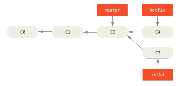 다른 상황을 가정해보자. 만드는 사이트에 문제가 생겨서 즉시 고쳐야 한 다. 버그를 해결한 Hotfix에 iss53이 섞이는 것을 방지하기 위해 iss53과 관련 된 코드를 어딘가에 저장해두고 원래 운영 환경의 소스로 복구해야 한다. Git 을 사용하면 이런 노력을 들일 필요 없이 그냥 master 브랜치로 옮기면 된다.