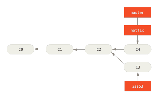 Merge 메시지에서 “fast-forward”가 보이는가. Merge 할 브랜치가 가리키는 커밋이 현 브랜치 커밋의 Upstream 브랜치이기 때문에 master 브랜치 포인터 는 최신 커밋으로 이동한다. 이런 Merge 방식을 Fast forward라고 부른다. 다시 말해서 A 브랜치에서 다른 B 브랜치를 Merge 할 때 B가 A 이후의 커밋을 가리 키고 있으면 그저 A가 B의 커밋을 가리키게 할 뿐이다. 이제 hotfix는 master 브랜치에 포함됐고 운영환경에 적용할 수 있는 상태 가 되었다고 가정해보자.